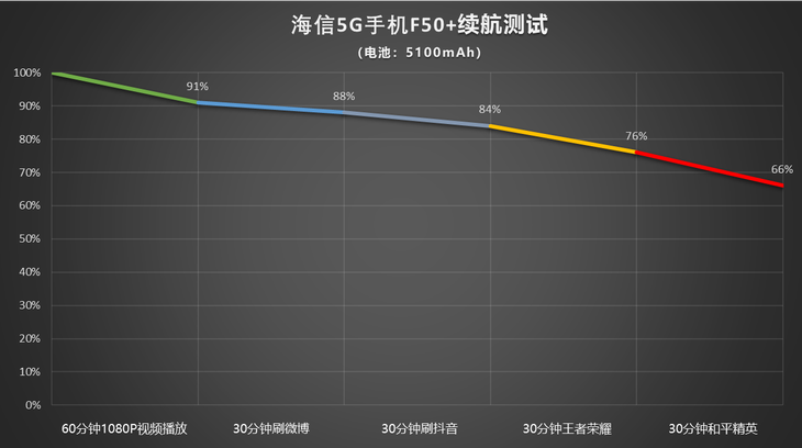 具体续航测试结果如上图,经过3个小时连续续航测试后,海信5G手机F50+仍旧能够剩余66%的电量,实际表现较为出色,即使在5G网络下使用也不用太担心。