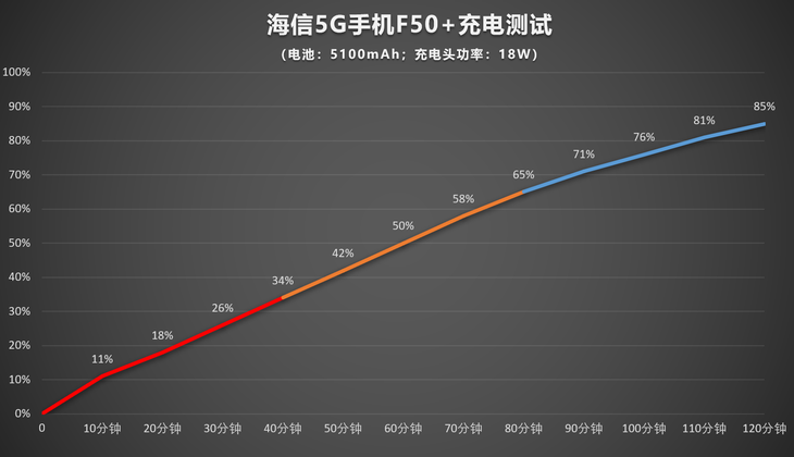 海信5G手机F50+内置了5100mAh超大电池,与之搭配的为18W充电,充电续航部分我们都进行了实测。