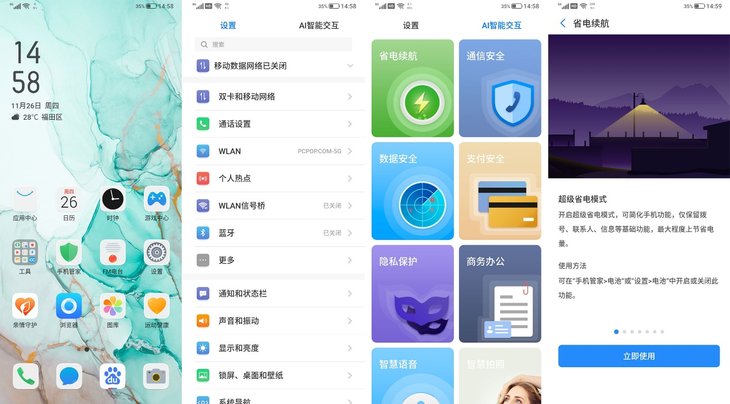 在设置页面,除了和主流手机一样列出各种设置选项外,海信5G手机F50+还对常用功能做了整合,也就是设置旁边的AI智能交互功能。在AI交互功能里,集成了常用的省电续航、商务办公,每个功能都会有相应的介绍,还提供一键直达,使用门槛低,且很方便。