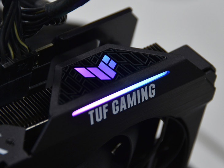 散热器顶部设计有的一条灯带和一个TUF的可发光LOGO,除了能够增添显卡的炫酷之外,也能够增加显卡的品牌识别度。
