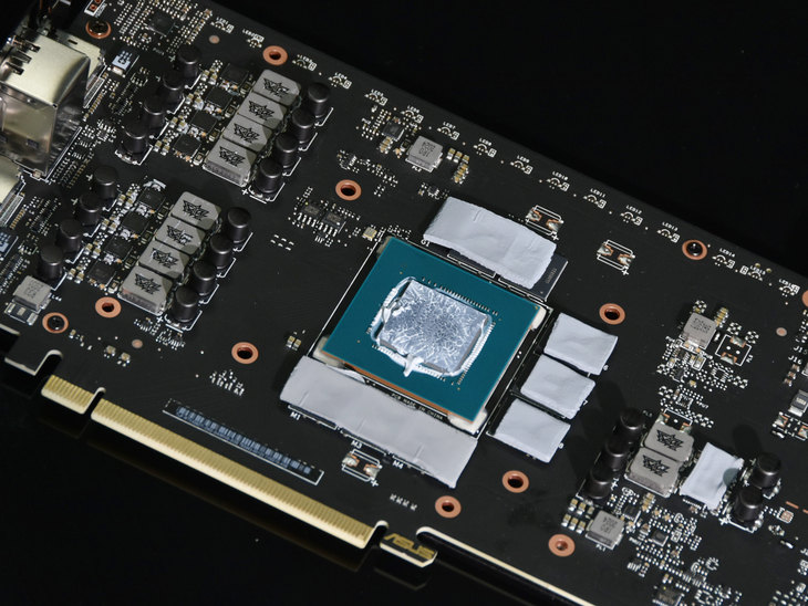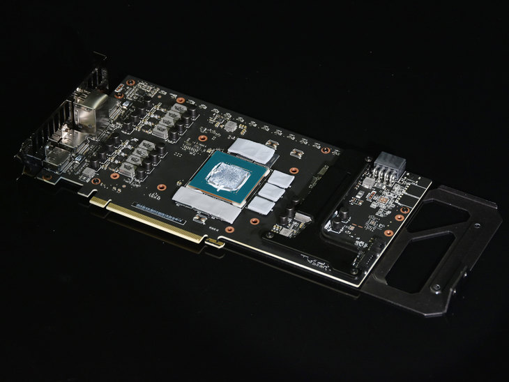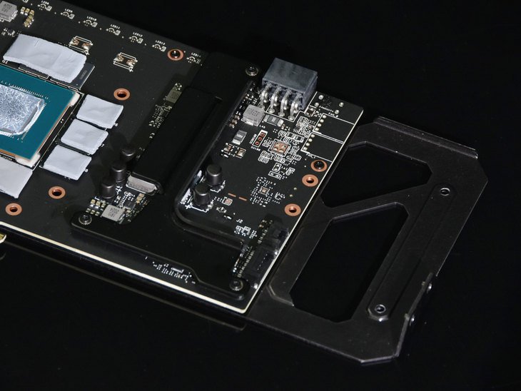 拆下散热器,一起来看看这款显卡的PCB用料。很明显,PCB要比散热器短上一截。