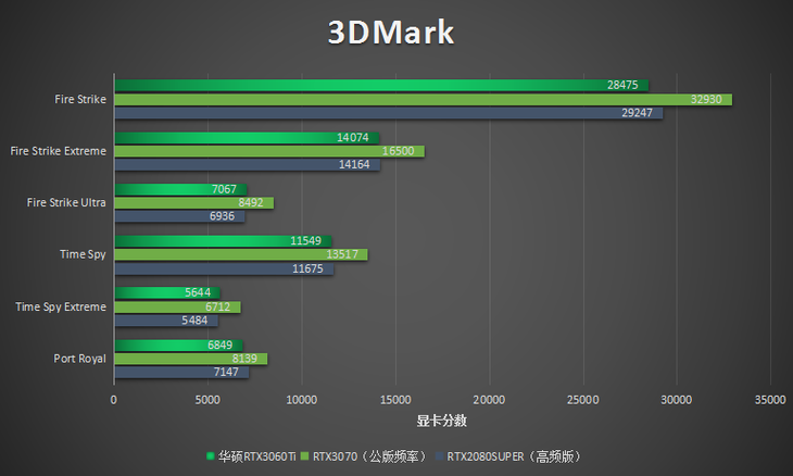 从3DMark基准测试的成绩来看,华硕这款TUF-RTX3060TI-O8G-GAMING显卡与上代次旗舰RTX2080SUPER的性能差不多。
