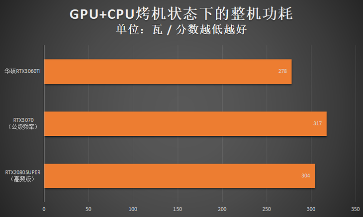 在GPU+CPU烤机状态下,华硕TUF-RTX3060TI-O8G-GAMING显卡的耗电量比上代次旗舰RTX 2080 SUPER是要低一些的。