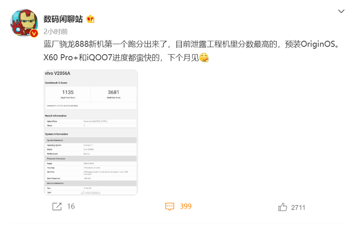 根据@数码闲聊站的信息,vivo骁龙888新机Geekbench 5跑分为单核 1135 分,多核 3681 分,是目前泄露工程机里跑分高的,这款工程机预装OriginOS。此外,@数码闲聊站还提到,X60 Pro+和iQOO7的进度都蛮快的,下个月见。