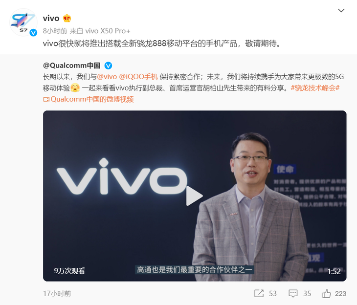 vivo已经在官方微博宣布,将会很快推出搭载全新骁龙888移动平台的手机产品,感兴趣的朋友可以期待一下。