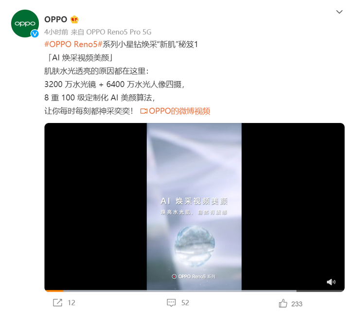 根据官方发布的视频,Reno5系列所搭载的AI 焕采视频美颜功能集成了8 重 100 级定制化AI 美颜算法,支持人脸分离式白平衡、AI肤色检测、AI分区磨皮、人脸三角模型重塑光影重构、AI补妆等。