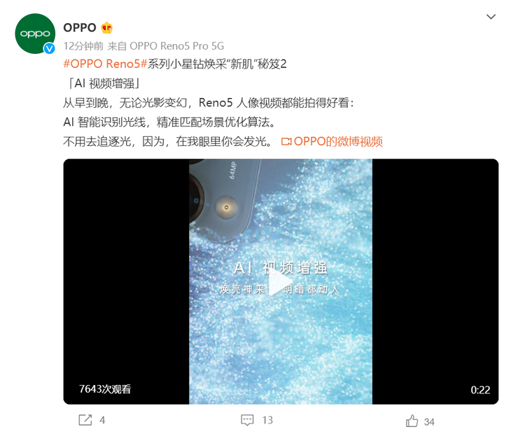 Reno5系列还支持AI视频增强功能,通过AI智能识别光线,与Live HDR视频算法、视频美颜算法、月光夜景视频算法结合,无论拍摄时处于怎样的观影场景,Reno5系列的人像视频都能呈现出焕采人像效果。