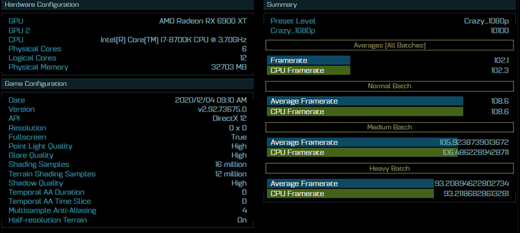 外媒较新曝光了AMD新卡皇RX6900XT在《奇点灰烬》这款游戏里的跑分成绩。1080p分辨率、Crazy画质下,其平均帧为102.1。