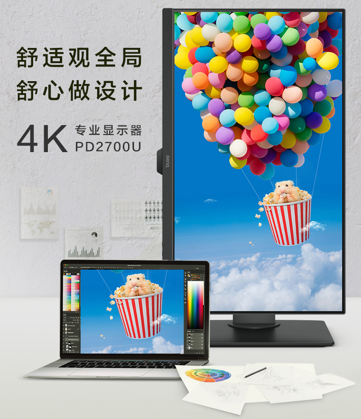 明基PD2700U 是一款兼具智慧调光技术与爱眼技术、主打专业设计的显示器。它使用27英寸的 IPS面板,最大分辨率为3840x2160(4K),响应时间 5ms,它覆盖了99%的sRGB高色域的同时有着出厂校色作保障,带回家时色彩就是准的,拆封即用省去校色烦恼。此外10-bit的色深(10.7亿色彩)和对HDR的支持也为您的设计保驾护航。色彩层次丰富,画面清晰没有颗粒感,相比普通的27英寸4K的屏幕来说,PD2700U定位更专业,能够满足专业性非常强的设计需要。