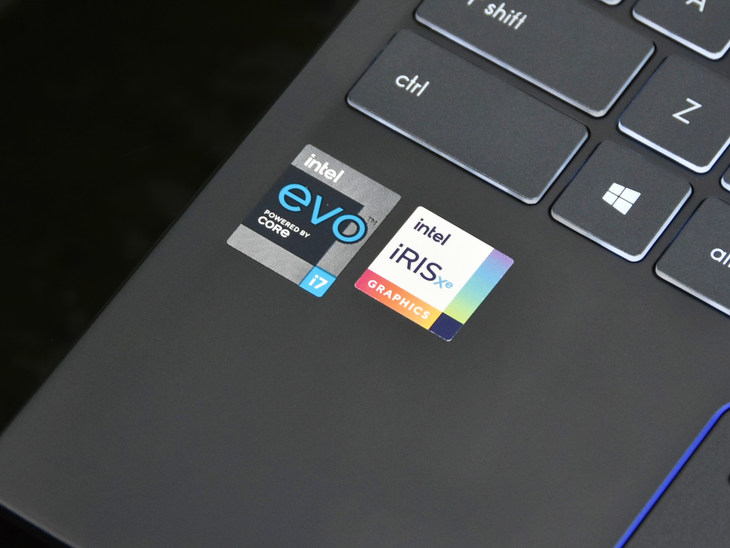 左侧手托上面贴有英特尔Evo平台认证以及锐炬Xe显卡的品牌贴纸。