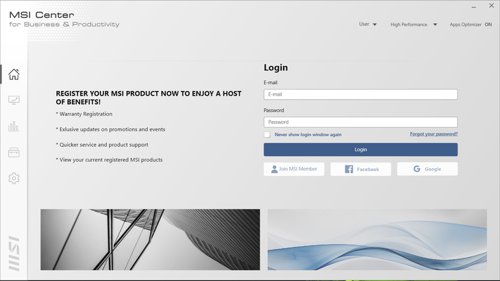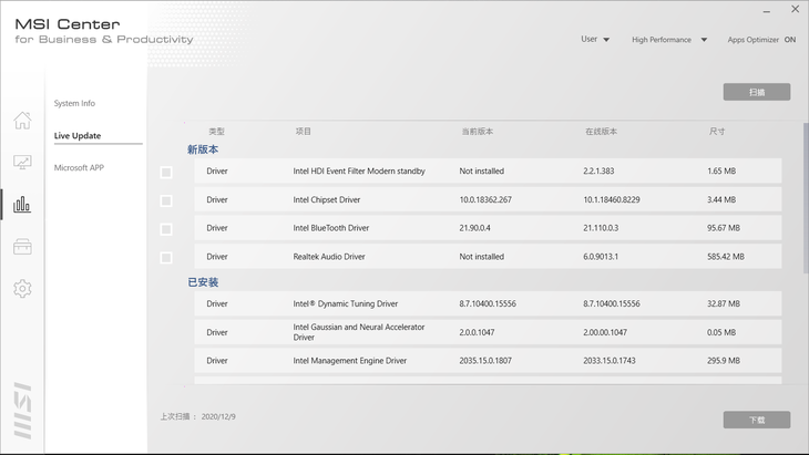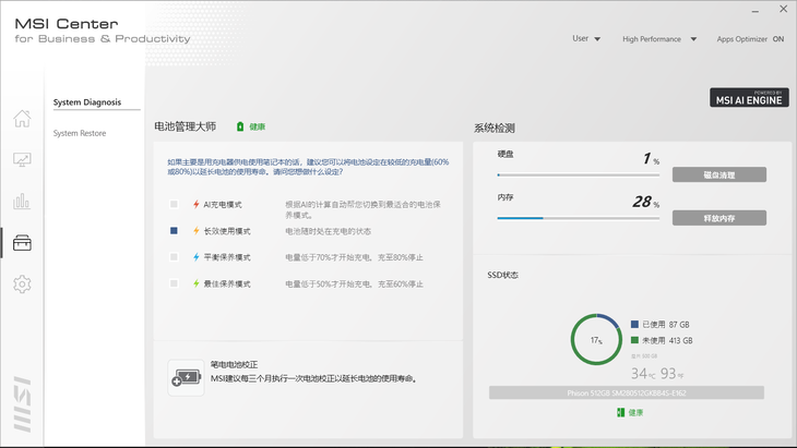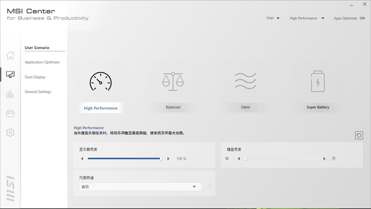 在第二个界面下,用户可以切换这款笔记本的运行模式。MSI Center提供了四档电脑运行模式,分别为High Performance高性能模式、Balanced平衡模式、Silent静音模式以及Super Battery超级续航模式,用户可以按需切换使用。