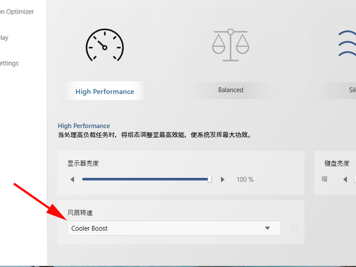 其中,在High Performance高性能模式下,用户可以选择风扇运行模式,包括自动、高级、Cooler Boost这三档风扇转速模式。Cooler Boost是这款笔记本的最大散热模式,风扇会全速运转,噪音值也会大幅提升,约达55分贝。如果你想追求静音效果的话,可以选择自动或者高级散热模式,这两种模式都挺安静的。