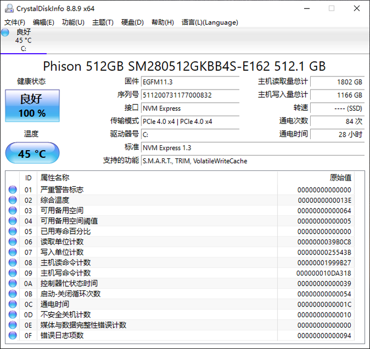 这款笔记本搭配了一块512GB容量、PCIe4.0 x4传输模式的固态硬盘。