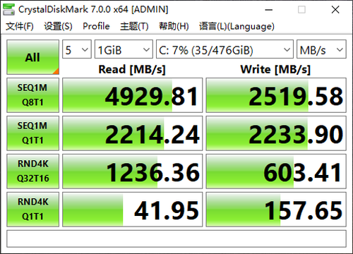 通过CrystalDiskMark这款测试软件的成绩来看,这块SSD非常棒,顺序读取速度更是有着接近5000MB/s的表现,不愧是PCIe4.0 x4的SSD。