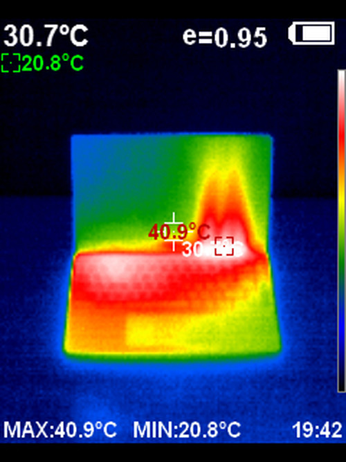 笔者还对这款笔记本的键盘面进行了红外线热成像测试。测试方法为:在高性能模式、风扇全速运转下,进行10分钟的CPU+GPU烤机,然后利用红外线热成像仪测试键盘面的温度。
