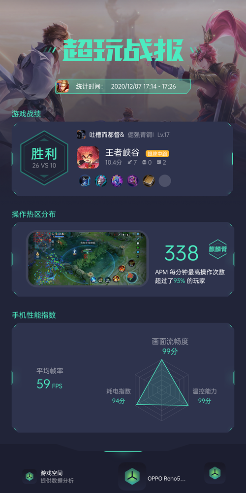 游戏结束后,「游戏战报」功能还可以让你一键分享游戏局内表现, 击杀、装备甚至是APM、操作热区、性能评分等数据,目前支持《王者荣耀》《和平精英》《QQ飞车》《穿越火线》这四款游戏。