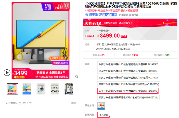 告诉广大设计师们一个好消息,明基PD2700U专业设计显示器眼下双12期间只要3449元,并且赠送12期免息福利,前20名消费者还可获赠屏幕擦,性价比相当之高。