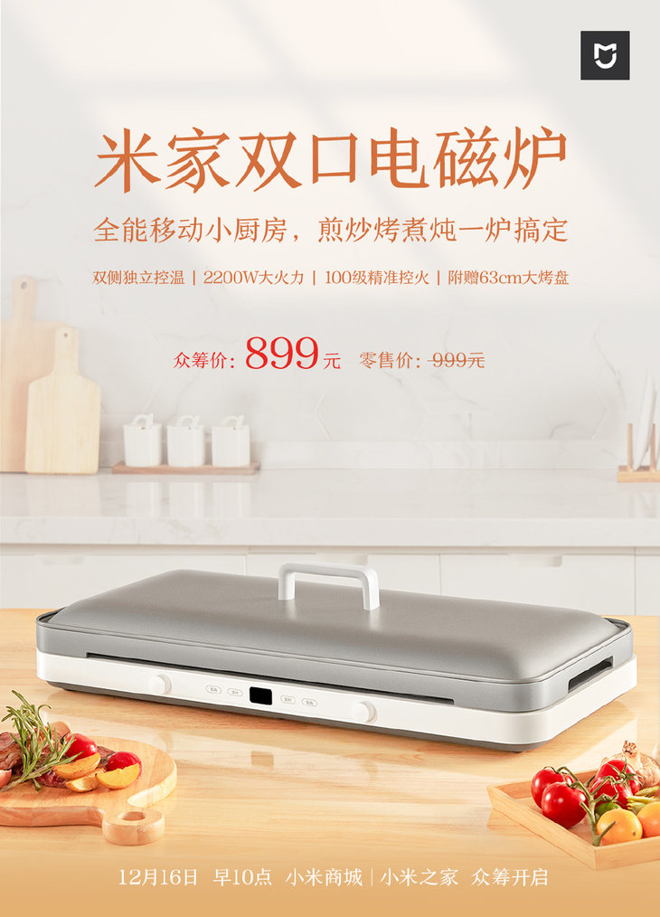 今天,小米智能生活官微表示即将推出全能移动小厨房-米家双口电磁炉。12月 16日早上10 点,米家双口电磁炉将会在小米商城、小米之家开启众筹,众筹价为899元。
