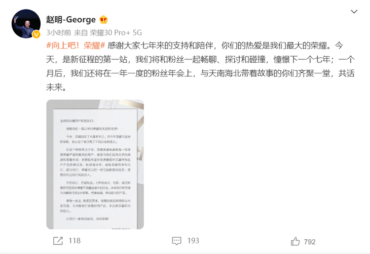 独立后的新荣耀也在今天先进正式发声,发表了一封公开信。公开信中提到,荣耀真诚感恩每一位使用荣耀产品和服务的用户,感恩所有让荣耀成长的人,创新、品质和服务已经成为根植于荣耀血液中的文化,未来将持续为消费者打造设计惊艳、性能卓越、体验超凡的产品。