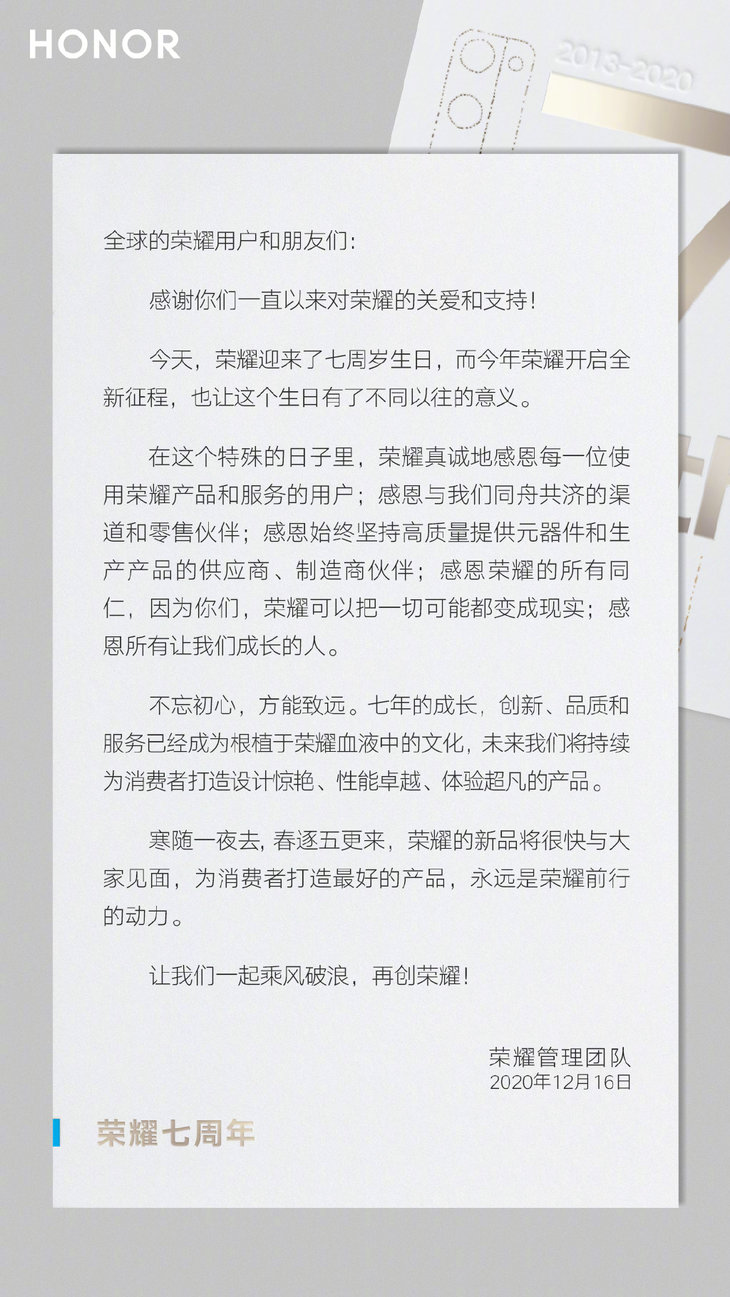 在公开信中还透露,荣耀新品将会很快与大家见面。按照往年的新品节奏,荣耀V系列将会在12月份发布,公开信中提到的新品很可能就是即将发布的荣耀V40系列。