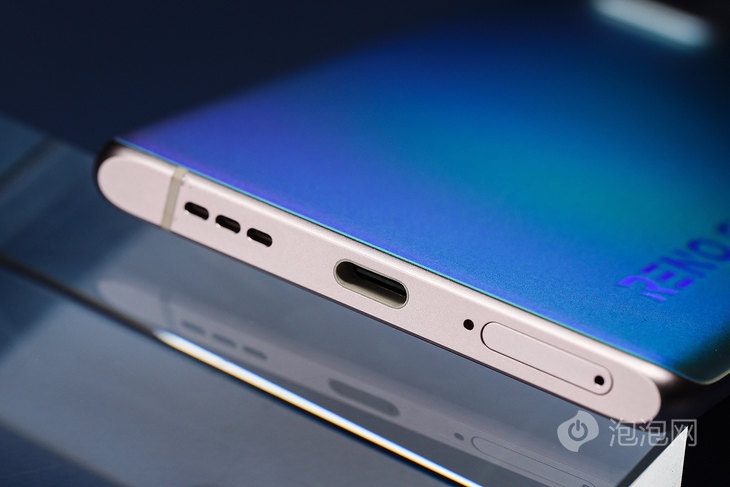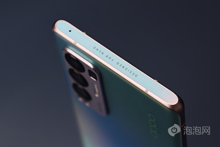 细节方面,Reno5 Pro+机身中框采用金属材质,机身顶部和底部均为纯平设计,顶部有“Design for Reno”字样,所有设计都透露着旗舰机的气息,更有设计感。