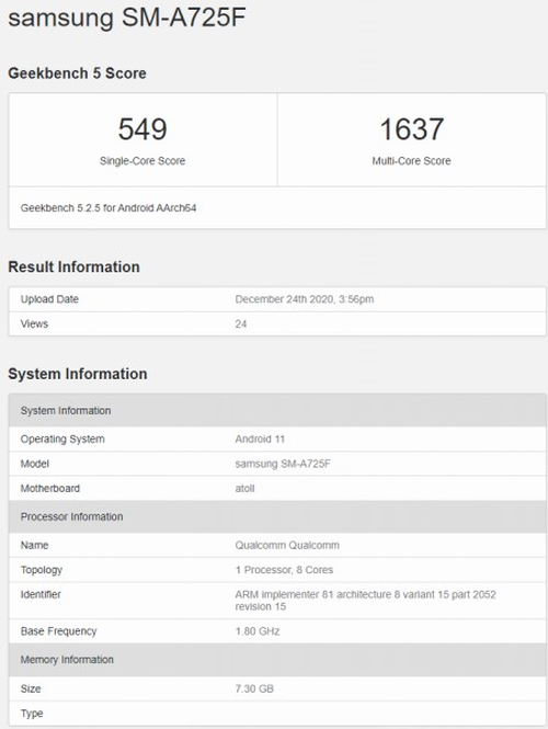 根据Geekbench上面的信息,三星A72 4G版单核得分为549,多核得分1637。这款手机搭载Android 11系统,拥有8GB内存,采用高通骁龙芯片,为8核心设计,基础频率为1.8GHz。