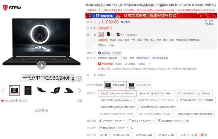 GS66,其不仅便携性上佳,而且还搭配有i7处理器、RTX2060光追显卡、240Hz专业电竞显示屏等强悍配置,实力不容小视!目前这款高性能轻薄游戏本的参考价格为11999元,并且拥有12期分期免息福利以及电脑背包、战利箱等好礼相送。