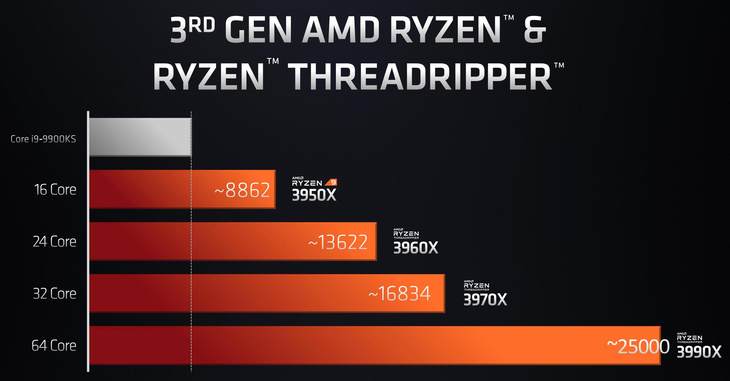 在CES 2020上,线程撕裂者3990X当属AMD最耀眼、最令竞争对手Intel亚历山大的大杀器。64核心、128线程设计,基础频率2.9GHz,最大加速频率4.3GHz,高达288MB的缓存,令这款HDET处理器拥有了一览众山小的性能。CINEBENCH R20的成绩直奔25000,远远得将自家的锐龙9 3950X乃至线程撕裂者3970X甩在身后。Intel那边更是毫无还手之力。