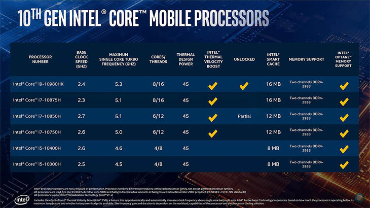 这是英特尔常规的产品换代。这一代标压移动处理器睿频更高、内存类型支持到DDR4-2933MHz、支持Wi-Fi 6等等。特别是这一代移动处理器开启了游戏本睿频5GHz新时代!