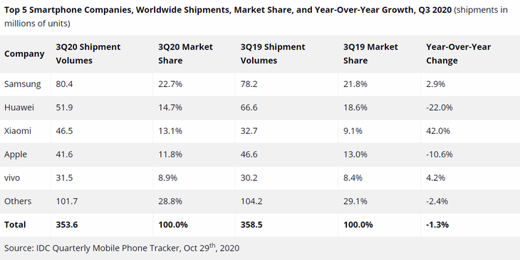 根据IDC公布的数据,在2020年第三季度,智能手机全球出货量达到3.536亿台,三星以8040万部的出货量位居领先,华为以5196万部出货量位居第二。在2020年过去的三个季度中,占据主要市场份额的仍旧是熟悉的三星、华为、小米、苹果、vivo、OPPO这些头部手机厂商,比较直观的变化就是每个季度出货量排名会有所不同。