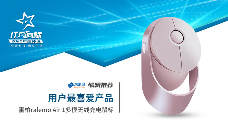 获奖理由:雷柏今年新推出了女性系列ralemo(乐萌),旨在为女性用户打造能带来全新感官体验的外设产品。雷柏ralemo Air 1鼠标采用了气垫式的设计,整体显得非常轻盈,实际重量也只有79g,不到1/5瓶矿泉水的重量,收纳携带都是非常便携轻巧。配色上,有四种风格的配色可供你多样化的选择,曼妙粉,知性蓝,微醺紫,冰沁银四款颜色,总有一款适合你。在靓丽外观之外,ralemo Air 1无线鼠标还有着Qi的加成。内置锂电池的设计让你不用担心电池没电怎么办,ralemo Air 1可以用标准的Qi无线充电,真正的摆脱线缆束缚,无线畅行。而在Qi无线充电之外还有USB-C的有线充电,为你准备另一个方案,没有后顾之忧。这款无线鼠标还有三种链接模式,蓝牙3.0、蓝牙5.0、无线2.4G,多种链接由你选择,还能支撑链接最多三个设备,电脑、平板、手机,随时切换进入到最 好的状态,可谓实力超群。