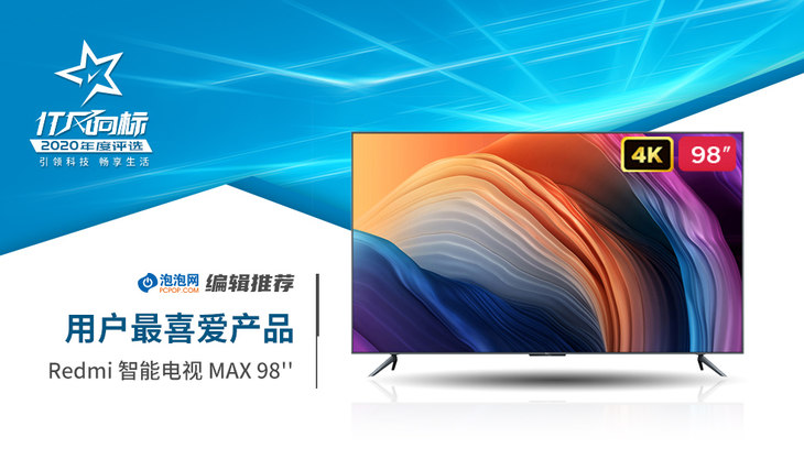 获奖理由:红米的产品向来以“极 致性价比”著称,Redmi智能电视MAX 98''仅19999元的上市价格,足以扣动大量用户们的心弦。当超大屏与高性价结合,除了尺寸足够的大,色彩足够的好之外,Redmi智能电视MAX 98''还搭配了红米电视不少先进的功能,例如PatchWall人工智能系统、小爱同学等等,令其有着相当高的智能化程度。搭配先进的Amlogic T972芯片,主频高达1.9GHz,能够流畅播放4K乃至8K影片,而85%的NTSC色域覆盖,192分区动态背光、MEMC技术以及HDR技术,有效保障这款巨幕电视高品质的画质。