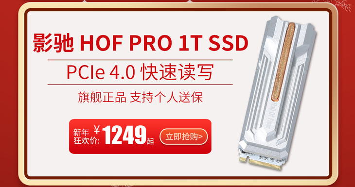 影驰 HOF PRO M.2 1TB SSD,依靠全新PCIe 4.0高速带宽,读写速度高达5000/4400 MB/s,疾速读写快人一步;严选可靠的3D NAND颗粒,大幅提高数据传输的稳定性;采用嵌入铜管的全尺寸铝壳,结合高强度散热硅胶,强效散热,现在入手,享受1249元起新年狂欢价。