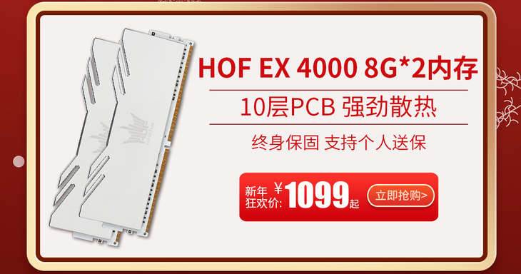 影驰 HOF EXTREME DDR4 8GB*2 内存,纯粹的信仰白与温润细腻的陶瓷镜面造就艺术品般的HOF EXTREME,有10层白色PCB,带来更优的电气布局,稳定运行无压力;搭载三星原厂B-die颗粒,赋予内存强悍超频体质,现在抢购,享受1099元起狂欢价和终身保固、个人送保。