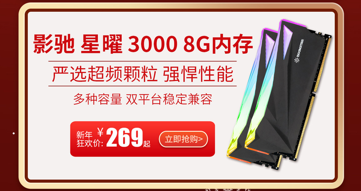 影驰 星曜 DDR4 内存,钻石透明导光罩设计让内置的8颗闪亮LED灯更加闪耀绚烂,其中预设了1680万种色彩,支持4大主板厂商灯控软件和影驰Aurora Sync For Memory灯控软件全平台调控,多容量、多种高频规格任君挑选,狂欢价269元起!