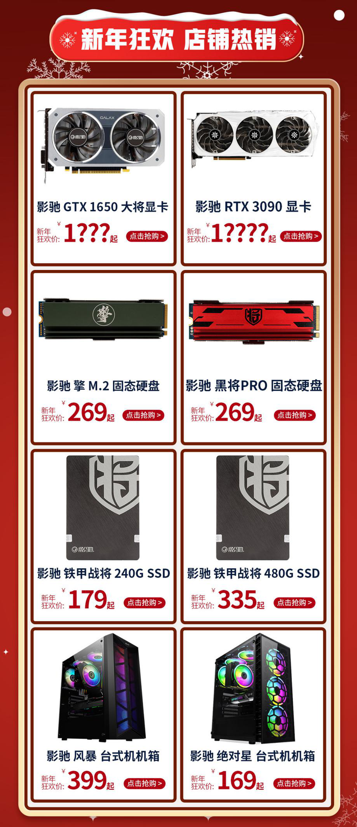 影驰 擎 M.2 SSD、影驰 黑将 PRO SSD、影驰 RTX 3090系列显卡、影驰 GeForce GTX 1650 大将、影驰 铁甲战将 SSD、影驰台式机机箱等多款店铺热销品以超值狂欢价出场,共同欢度新年。
