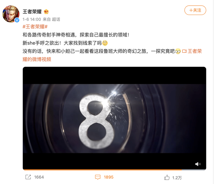 在去年底华为nova8系列新品发布会上,华为就曾公布将会与《王者荣耀》深度合作,并将首批支持90FPS的《王者荣耀》。在此次王者荣耀官方释出的视频中也明确出现了数字“8”,似乎也在寓意nova8系列。