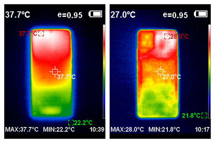 包括VC均热板、各类散热膜、碳纤维和导热凝胶在内,iQOO 7的散热总面积高达17733mm,是iQOO产品有史以来最大的。经过实测,在跑分结束之后,手机正面的温度最高为37.7℃,背面最高温度为28℃,发热并不严重。
