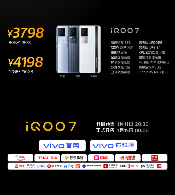 iQOO 7售价3798元起,将会在1 月 15 日 0 点正式开售。