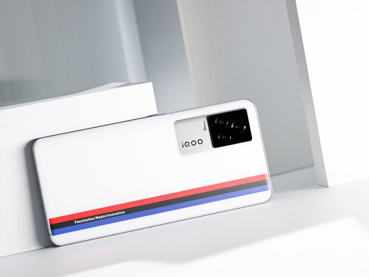 iQOO 7传奇版机身背面主要为纯白哑光效果,搭配标志性三色条纹,可以营造出速度感。中框采用了“航海铝”材质,拥有更好的抗腐蚀性和韧性。