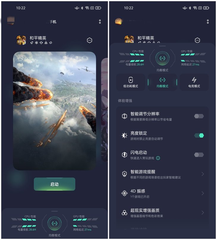 在游戏助手中,还提供4D振感功能。开启该功能后,在特定的游戏场景会提供不一样的振动反馈,丰富交互体验。4D振感功能目前已经适配了《和平精英》、《王者荣耀》、《量子特工》这三款游戏,不同游戏振感会有所不同。