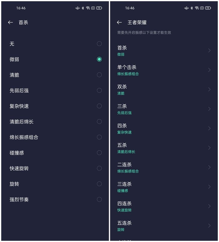 在《王者荣耀》游戏,你能够调节每个场景的振感。比如首杀为微弱的振动,单个击杀是绵长振感组合。系统提供了丰富的击杀场景和振感效果,你可以根据自己的喜好定制振感。