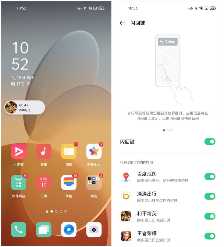 Reno5 Pro+支持闪回键功能,玩《和平精英》时,当你在等待过程中返回桌面,Reno5 Pro+会在桌面以悬浮窗的形式同步展示起飞倒计时或者《王者荣耀》的死亡倒计时,即使返回桌面等待也不用担心错过游戏开局等。