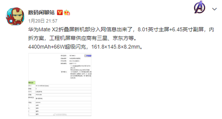 1月21日消息,今日在社交平台上有数码博主@数码闲聊站曝光了华为Mate X2折叠屏手机的更多信息。