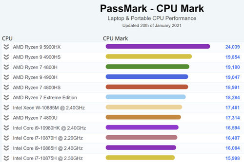其中,旗舰级的锐龙9 5900HX在PassMark移动CPU性能排行榜上面轻松夺魁,跑分比AMD上一代的锐龙9 4900HS要明显高出很多。