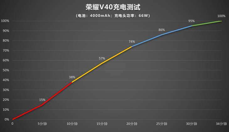 荣耀V40还支持66W有线快充,其中荣耀V40高配版还支持50W无线充电。在66W有线充电的实测中,只需34分钟就能从0到100%的电量,有效缩短了充电等待时间。