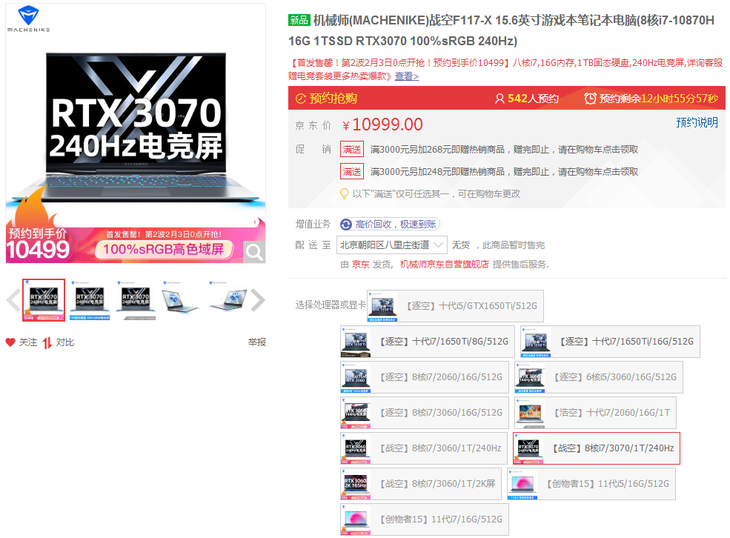 机械师【战空】F117-X游戏本定位旗舰,秉承了不妥协的设计理念,在硬件配置、灯效颜值、轻薄便携等方面均具备上乘的表现,能够满足广大消费者娱乐、办公等多样化的使用需求,实现更多价值。此次推荐的这款机械师【战空】F117-X搭配有酷睿i7-10870H八核心处理器、NVIDIA
