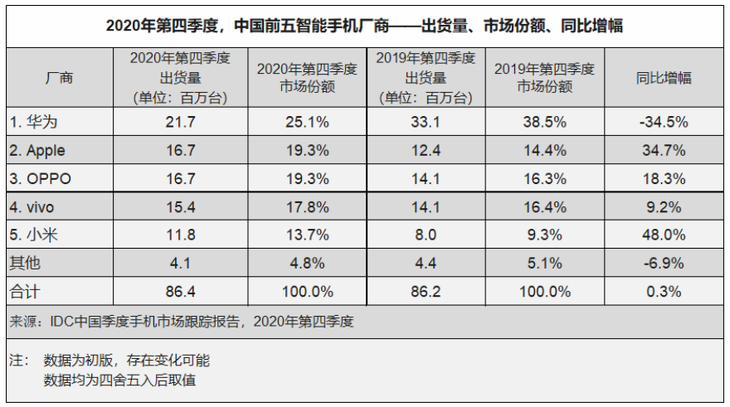 近日,国际数据公司IDC公布了2020年第四季度中国智能手机市场出货量数据,约为8640万台,同比上升0.3%。OPPO在第四季度的销量出现了18.3%的高速同比增长,主要得益于OPPO A32、Reno 5系列等爆款产品的推动。