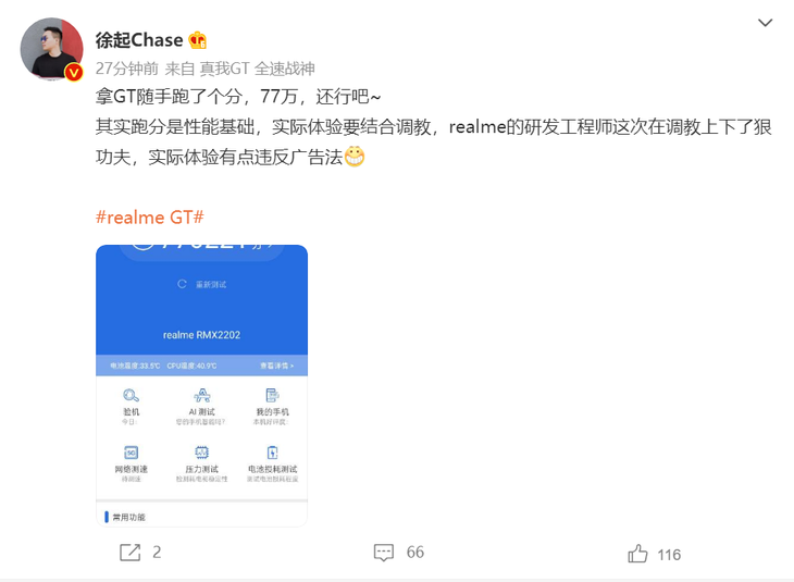 据@徐起Chase在微博透露的信息,真我GT新品的安兔兔跑分达到77万+,这样的跑分成绩非常优秀。