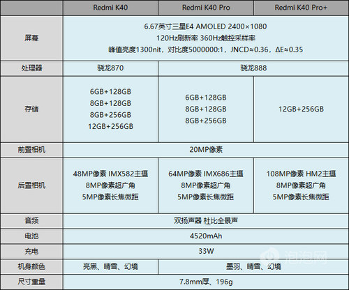 Redmi K40系列的三款手机在机身尺寸及重量上是保持一致的,主要是在配置上稍有区别,通过表格我们可以比较清晰的看到K40系列三款机型主要配置上的差异。